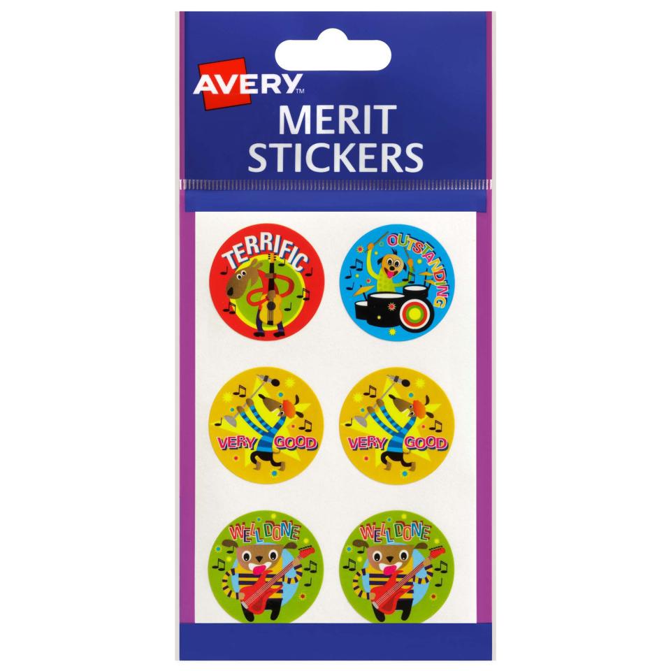 Ensure that your marking, rewards and merits really stand out from the pack with the Avery® cartoon band merit and reward stickers. Each sticker features a bright and colourful dazzling design with words like 'Terrific', 'Well Done', 'Very Good' and more alongside a graphic of an animal playing a musical instrument. Each sticker has a 30mm diameter and comes in a pack of 102 stickers with 4 different designs. Perfect for teachers or parents wanting to reward good behaviour and work.