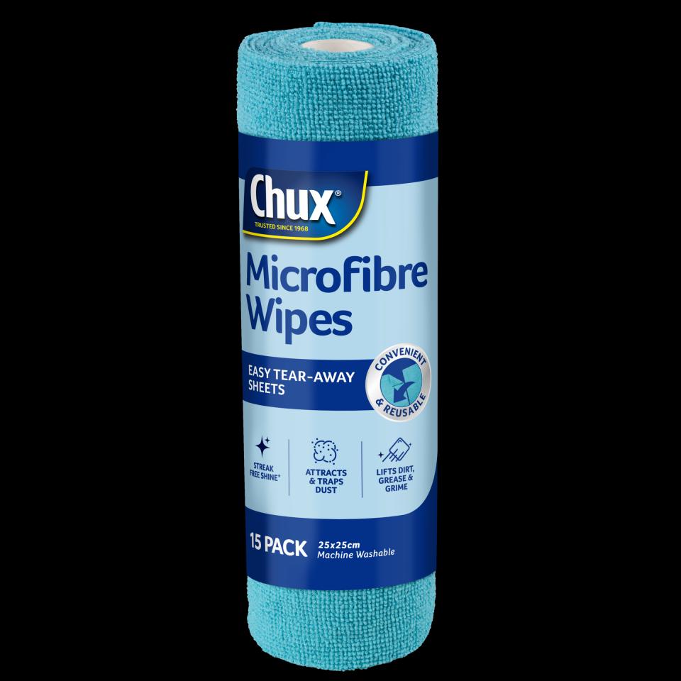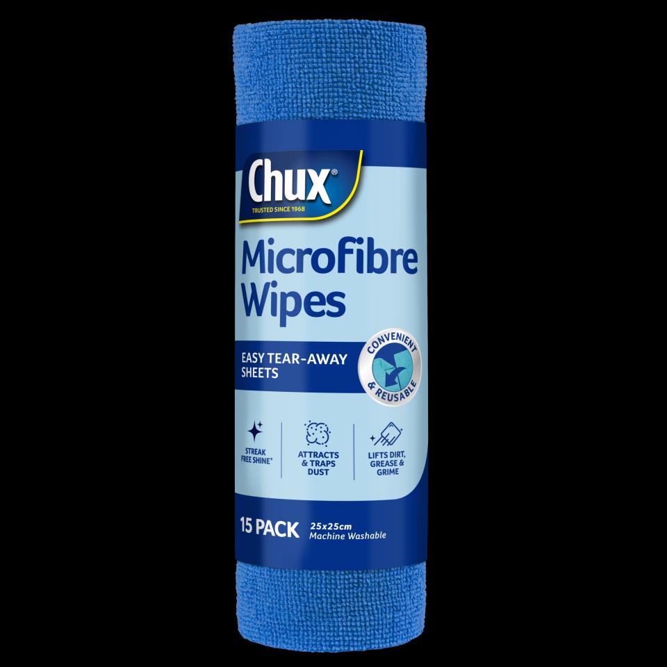 Chux® Microfibre Wipes 15 Pack in Teal and Navy Blue make everyday cleaning simple. These reusable, super-absorbent cloths deliver a lint- and streak-free clean^ on glass, mirrors, stainless steel, tiles, and more. Used dry, they