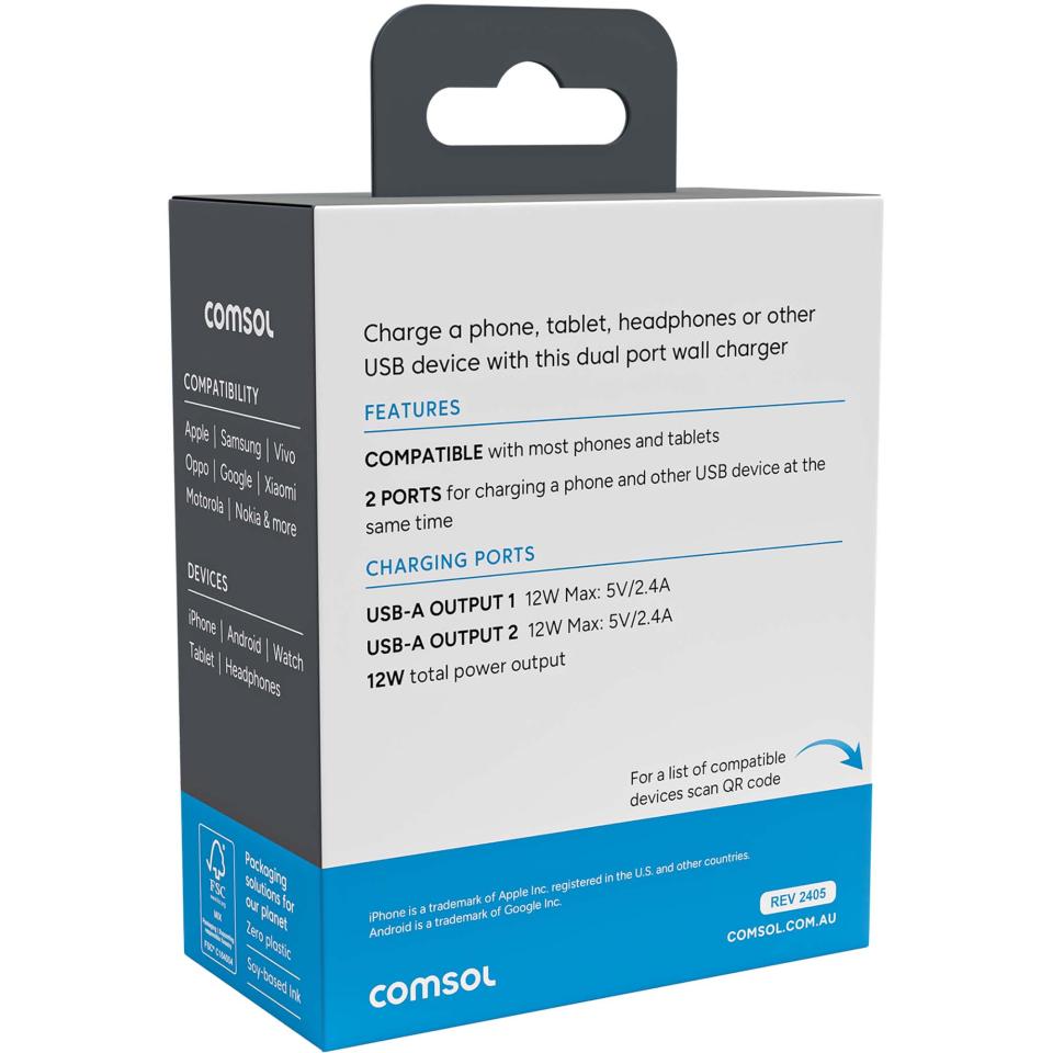 Stay powered wherever you are with the Comsol 12W 2 Port USB-A wall charger, designed to keep your essential devices ready to go. Featuring dual USB-A ports, you can charge your phone and another device simultaneously, saving time and keeping you connected. With universal compatibility across Apple, Samsung, Google, Oppo, Vivo, Motorola, Nokia, Xiaomi and more, it’s the perfect all-in-one solution for home, office, or travel. Delivering up to 12W of total power with 5V/2.4A output per port, it ensures efficient charging for smartphones, tablets, headphones, smartwatches and more—so you can stay productive and entertained without interruption.