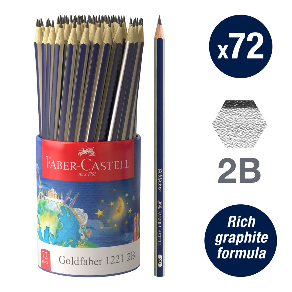 Create expressive, lifelike sketches with Faber-Castell Goldfaber Graphite Pencils. With smooth, rich break-resistant leads made from blended graphite & clay and a variety of hardness degrees to choose from, these pencils are great for writing, drafting and sketching. Packed in a durable metal cup of 72, this set provides great value for classrooms, studios, families and other group settings.