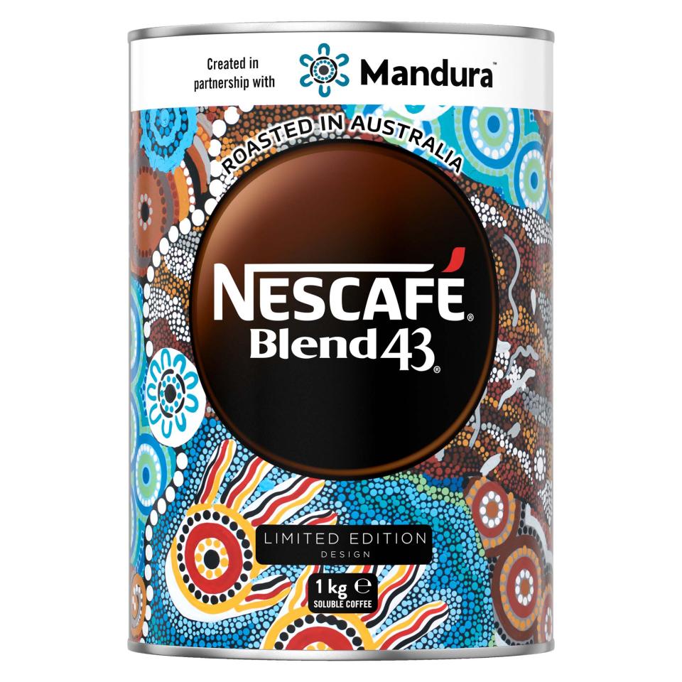 This NESCAFÉ Blend 43 tin was created in partnership with Mandura, a First Nations business committed to creating real change for young First Nations Australians. 20% of Mandura’s profits support the Pauline E. McLeod Foundation, which focuses on First Nations mental health, entrepreneurship, education, and positive employment opportunities.