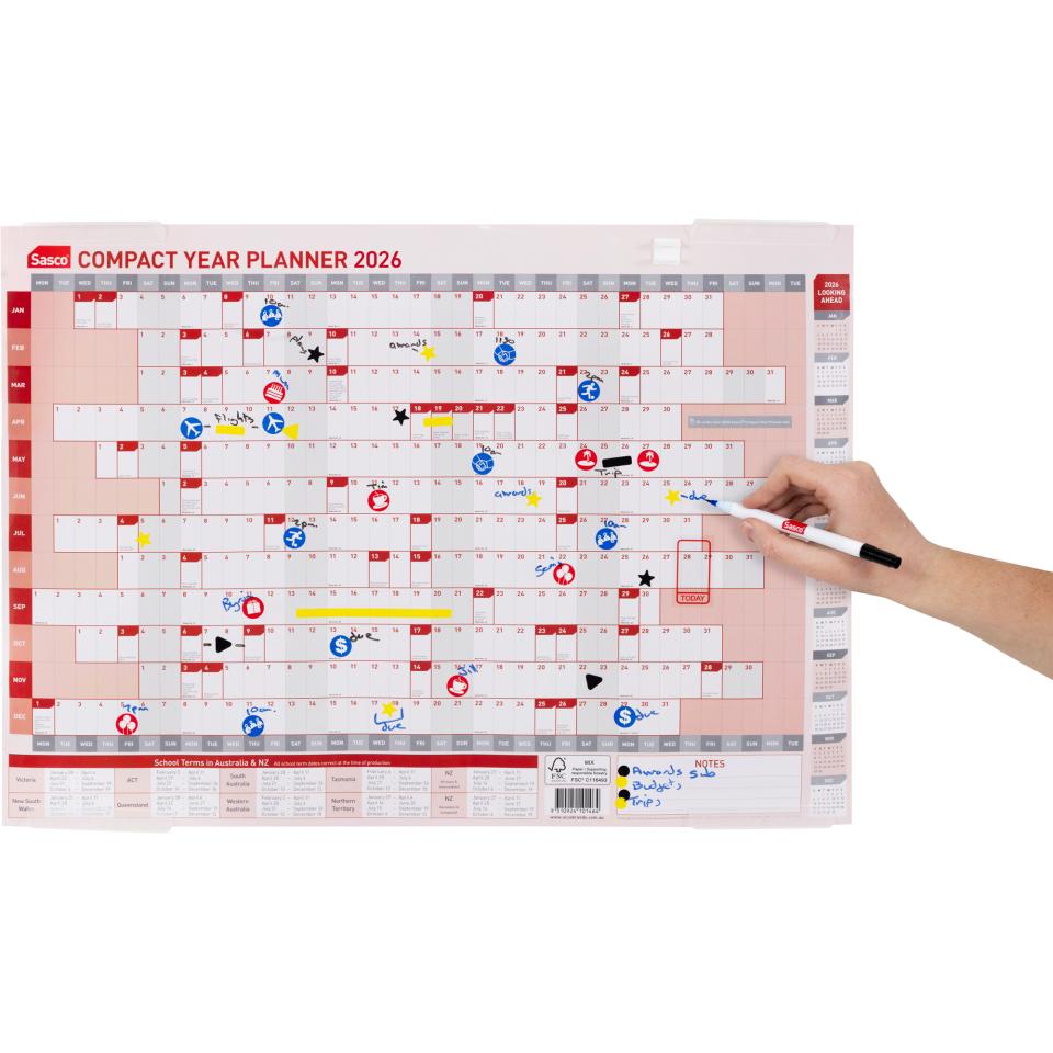 Be ready for the year ahead with this Sasco 2026 compact year wall planner. Ideal for limited spaces, this planner provides a clear overview of your year. Includes a handy pen kit for notes and plans. Perfect for home office, workplace or any work environment.